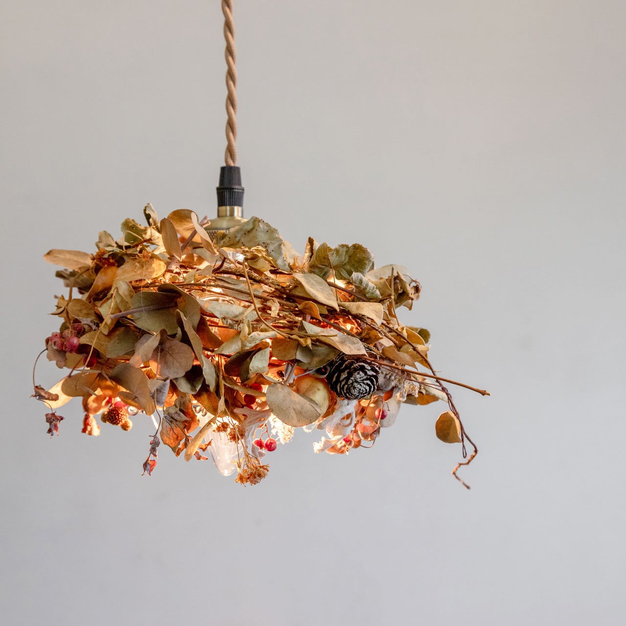 木の実や野花などの彩りを添えて大人の可愛らしさをプラスした シブカワ華やな「よそおいリース」がシェードの ペンダントライトです。 出会う草蔓は年によって、季節や天候などによっても左右されます。 規格通りや、予定通りにいかないもの魅力のひとつ。 同じものは2つとない“おまかせ、セミオーダーメイド”を おおらかに楽しんで頂けましたら幸いです。 商品はご注文いただいてから、心を込めて制作します。 ご要望ありましたら、備考欄にご記入ください。 3週間ほどのお時間をいただいています。注文をいただいてから、オーダーメイドでお作りしていますので、何卒ご了承ください。ギフトなど、どうしても、、この日までに、、という時は一度ご相談くださいませ。 ーーーーーーーーーーーーーーーーーー シェード 素材 ドライorセミドライ植物 サイズ Sサイズ (直径 約15cm〜18cm) 灯具 ねじりコード100cm 真鍮ソケット 口金E26 引っ掛けシーリング式 電球(別売り) ※必ずLED電球をご使用ください (普通電球の60W相当以下) ーーーーーーーーーーーーーーーーーーー ※掲載の写真は、あくまでも一例です。実物とは異なりますのでご注意ください。 ※火災の恐れがありますので、必ずLED電球をご使用ください。 ※配送の段階で微小な素材落ちの可能性がありますが、自然素材特有のものとして、予めご了承ください。 ※高温多湿での保管、ご使用はカビの原因となります。
